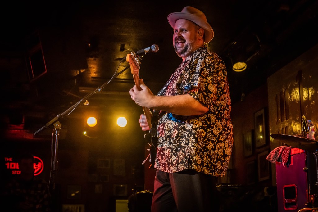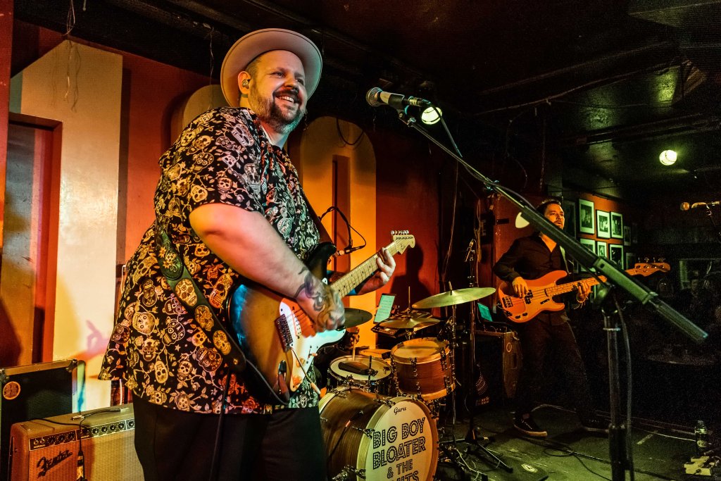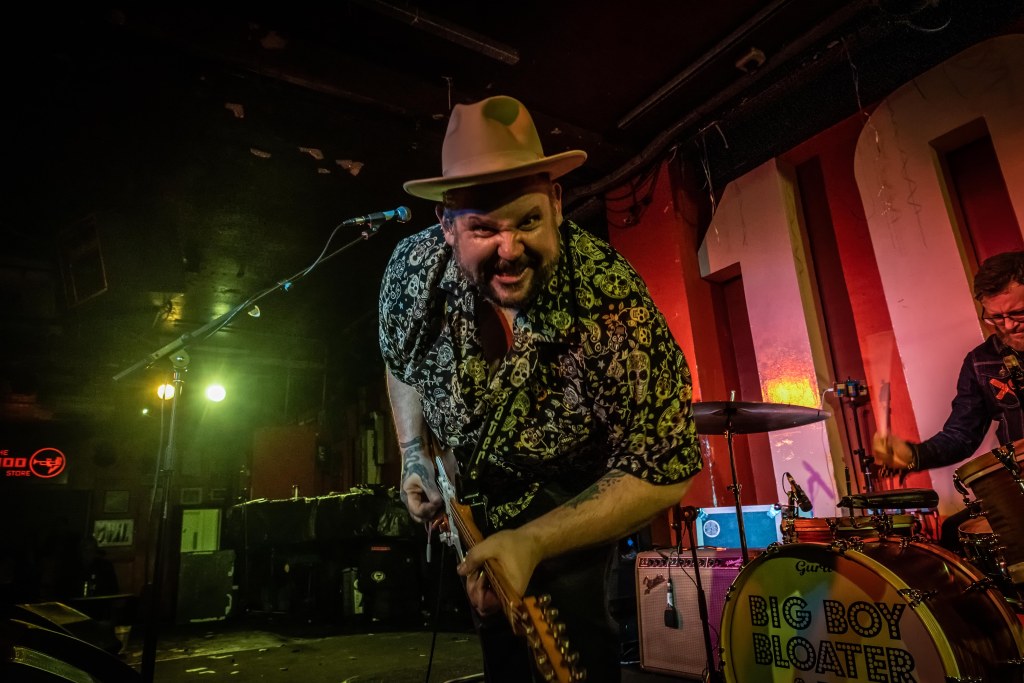 What better way to spend a Sunday night than at the iconic 100 Club watching great musicians? Big Boy Bloater & the Limits played the 100 Club on the last night of a short UK tour. The venue was reasonably full and certainly the weather and Monday Morning’s proximity would have had an adverse impact on the crowd. The three-piece – Big Boy Bloater on Guitar and Lead Vocals, Steve Oates on Bass and Matt Cowley on drums – took to the stage to the Twilight zone theme “You are travelling to another dimension…. etc” and we were most certainly transported to a different dimension of Rhythm & Blues and Rock & Roll. Opening with “The Saturday Night Desperation Shuffle” a straightforward blues shuffle to get the band and the audience warmed up and straight into “I love You”, a much rockier piece altogether, that kept the rhythm up and toes tapping. After a cautionary tale about “Messing with the Booze”, Bloater confirmed that “Friday Night’s Alright for Drinking” a tasty little country rock ditty with some fine slide playing from the man. “Stop Stringing Me Along”, the angriest song Bloater’s ever written apparently, about the record industry of old where the man with the big cigar promised all but delivered nothing. The band engaged the audience in a bit of clap-along and some call and response on “That Ain’t my Name”. You must remember that Big Boy Bloater is a larger than life character Iin every way; A Man Mountain for sure, with a personality to match and a deep joy in what he does. He is a performer in every meaning of the word and the audience respond to that as he and the band power through a long set list, loaded with great tunes, witty lyrics and a lot of fun.